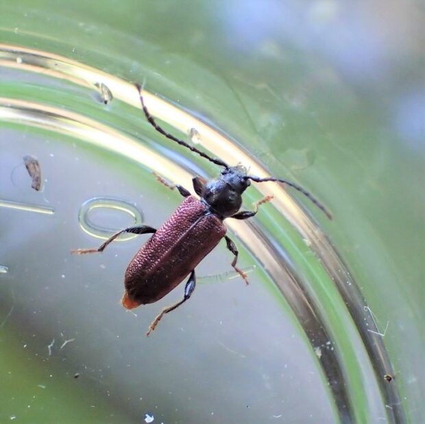 平地~山地に生息し、 春、 スギなどの針葉樹の伐採木で普通に見られるカミキリムシ。 上翅の色は、 オスは赤褐色や青黒色で変化がありますが、 メスはどれも赤褐色です。 メスは針葉樹の皮付き丸太や衰弱木の樹皮に産卵し、 幼虫は、 それらの樹皮や樹皮の下の部分を食べて育ちます。