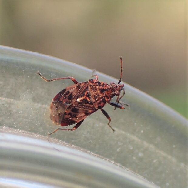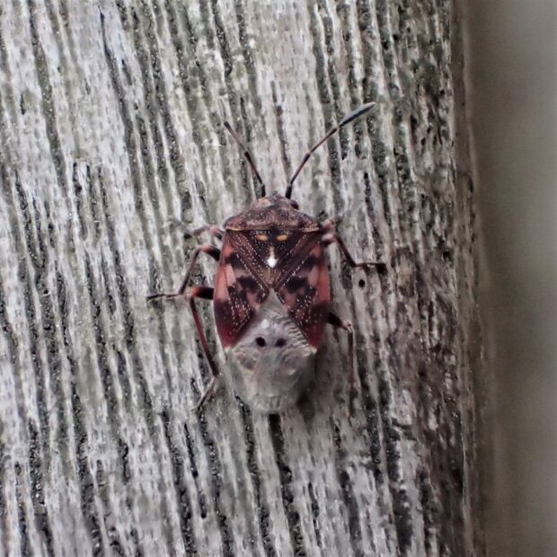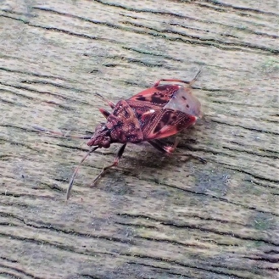 紫がかった赤褐色で、 黒い斑点がある小さなカメムシ。 小楯板(しょうじゅんばん=胸の逆三角形の部分)に、 白いY字模様があり、 膜質部(透明なはねの部分)には黒い点が2個あります。 ヤスマツナガカメムシ、 イシハラナガカメムシに似ています。 (MT)