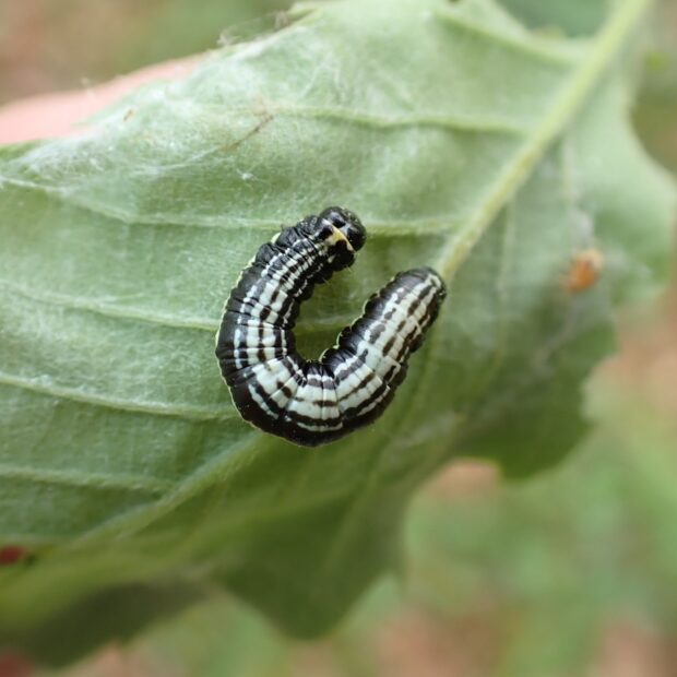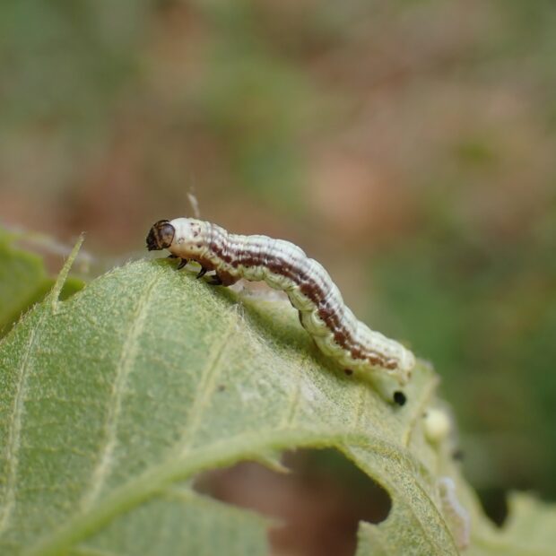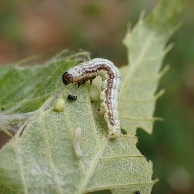 • 幼虫。 葉をつづった中にいる。