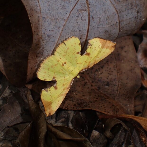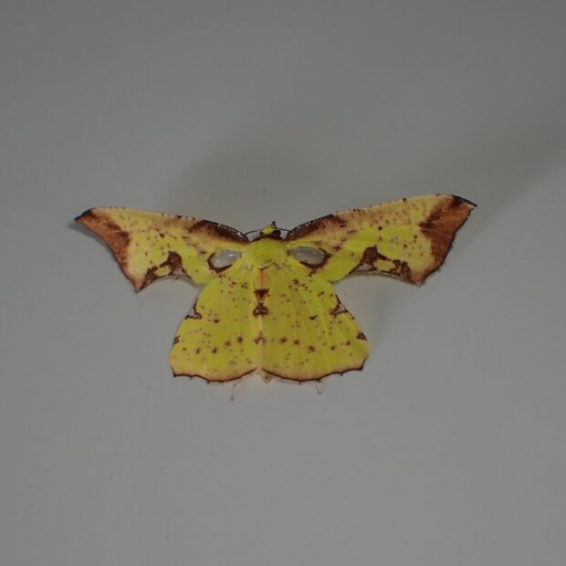 鮮やかな黄色(ウコン色)で、 はねのまわりに茶色の紋があるエダシャクの仲間。 オスは前ばねのつけねに小さな半透明の窓のような模様があります。 メスにはそれがありません。 前ばねを水平に広げてとまります。