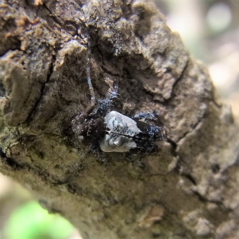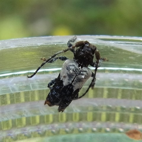 早春から初冬まで長い期間見られる小さなカミキリムシ。 主にタラノキの弱った木や枯れた木に集まります。 上翅(じょうし)の基部の白い部分は微毛が密生し、 輝くような白に見えます。