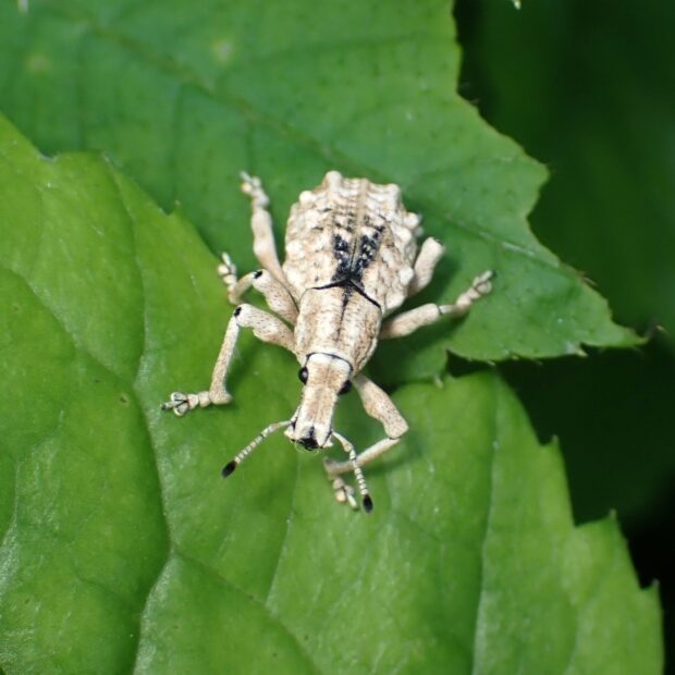 ヤツデやタラノキなどで見られるゾウムシ。 体は白っぽくでこぼこしており、 背中に黒い部分があります。 白い色は鱗片(りんぺん=細かいうろこ)の色で、 だんだんはがれてきて黒っぽくなります。