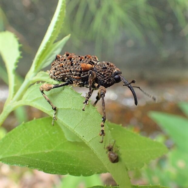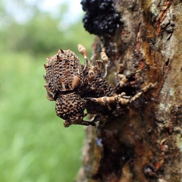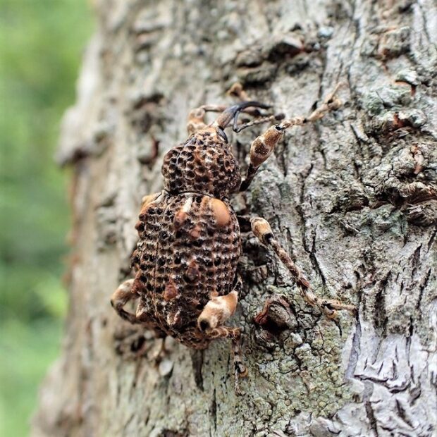 アナアキゾウムシの仲間。 茶色い体は穴だらけで、 ゴツゴツしたコブがあるゾウムシ。 近づくとポトッと落ちてしまい、 あしを縮めて死んだふりをします。 ヌルデの樹液でよく見られ、 明かりにもやって来ます。