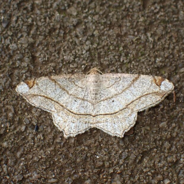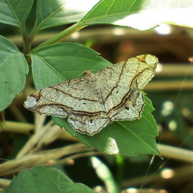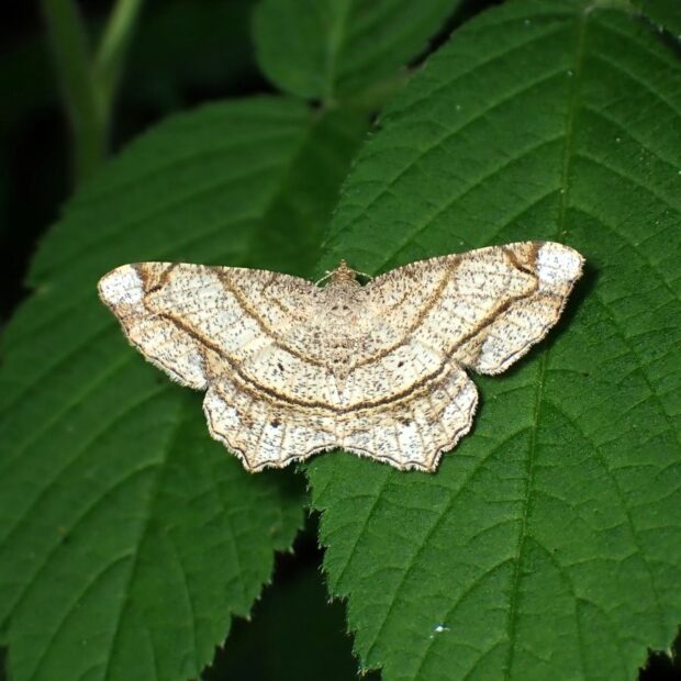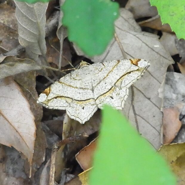 幼虫がネムノキの葉を食べるエダシャクの仲間。 前ばねと後ばねにある線がつながりVの字に見えます。 「フタテン」は後ばねの二つの黒い点を指し、 「オ」は後ばねの出っ張っりを指すものと思われます。