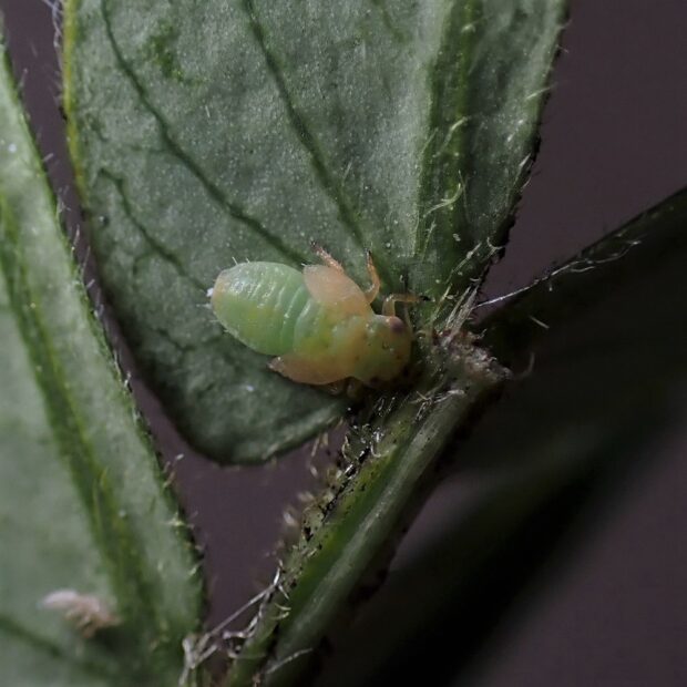 ネムノキの蕾や新芽の汁を吸うキジラミ。 キジラミは小さなセミのような姿をしており、 アブラムシやカイガラムシに近い仲間になります。 体の色は緑色~褐色。 幼虫はお尻に白い糸のようなロウ物質をつけています。 (MT)