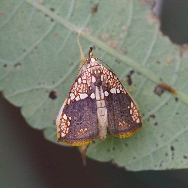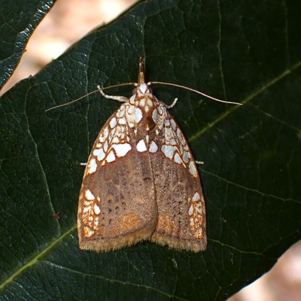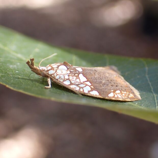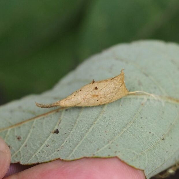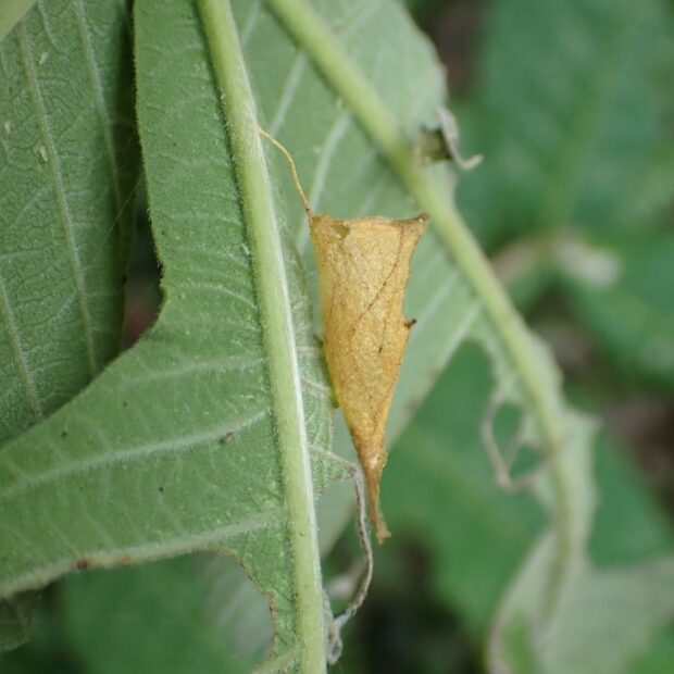 網目模様があるリンガの一種。 顔の前は長く伸び、 はねの色は変化がありいろいろです。 幼虫はヌルデの葉を食べ、 葉の裏につくる繭は、 おもしろい形をしています。