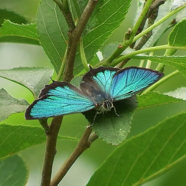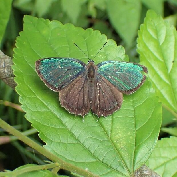 シジミチョウの仲間。 オスのはねは金属光沢のある緑色。 メスの表ばねはこげ茶色で、 青い紋があるもの、 オレンジ色の紋があるもの、 紋のないものなどさまざまです。 日中はあまり動かず、 夕方になるとハンノキの周りをめまぐるしく飛びかいます。