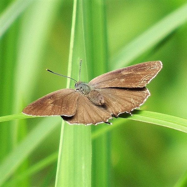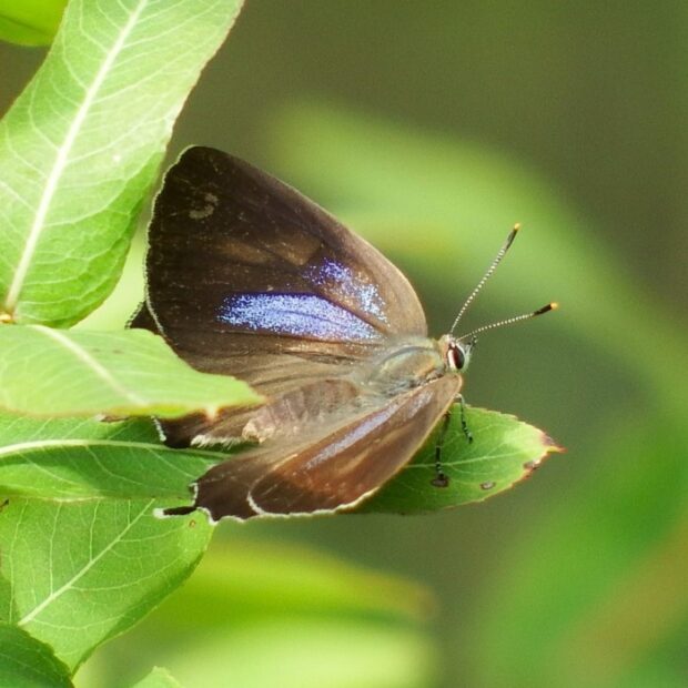 • メス。 こげ茶色のはねに青っぽい紋がある。