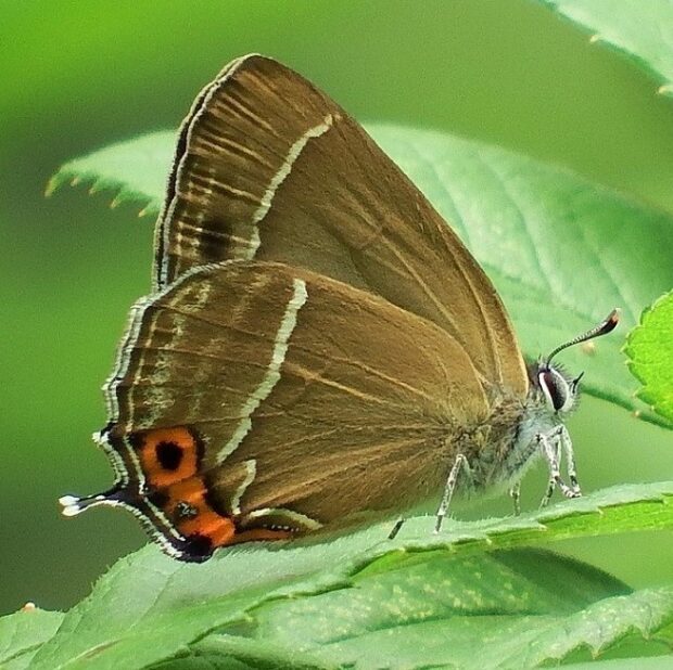 • 裏ばね。 うす茶色のはねに白い帯とオレンジの紋、 しっぽのような尾状突起がある。