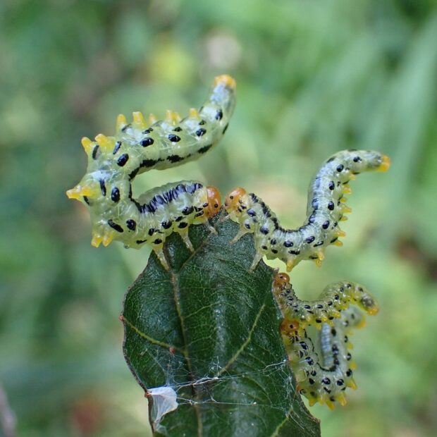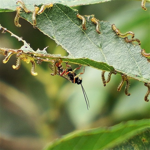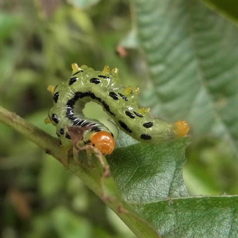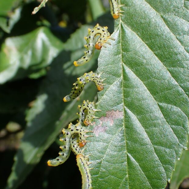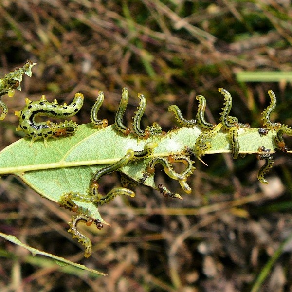 幼虫が葉を食べるハバチの仲間。 ヒラアシハバチの幼虫は葉のふちに並んで、 ハンノキなどの葉を食べます。 幼虫は、 頭は黄色、 体は黄緑色で黒い点々があり、 お尻を上に持ち上げそっくり返る姿勢をとります。