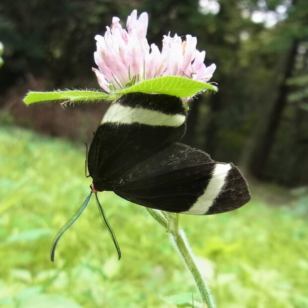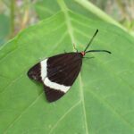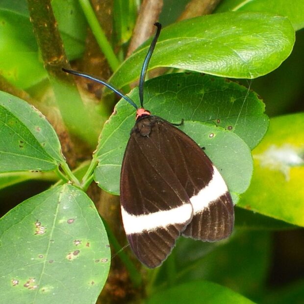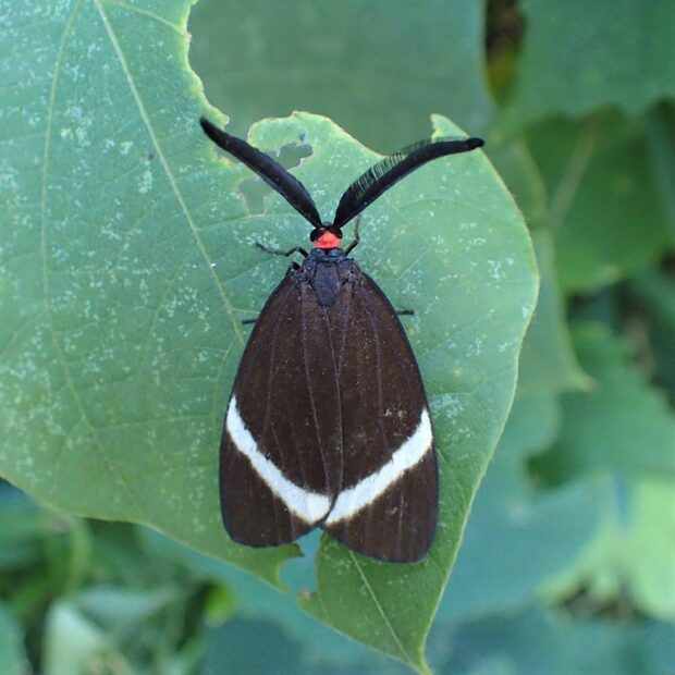 街中でも見られるマダラガ科の仲間。 昼間に、 林の薄暗いところをヒラヒラゆっくり飛ぶことが多く、 はねの白い帯が目立ちます。 頭が赤く、 はねが黒いところがホタルに似ていることからホタルガと名づけられました。