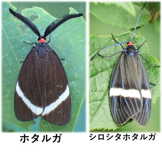 はねの白い線がV字に近いのがホタルガ、 はねに青みがあり白い線が高い位置で水平に近いのがシロシタホタルガです。
