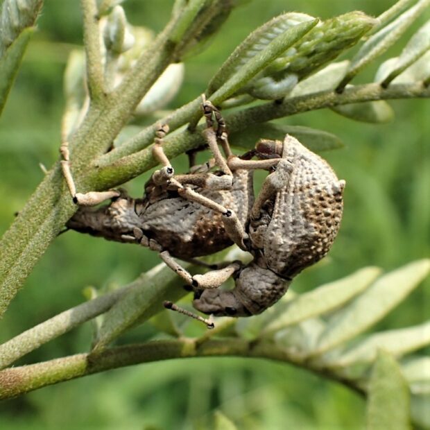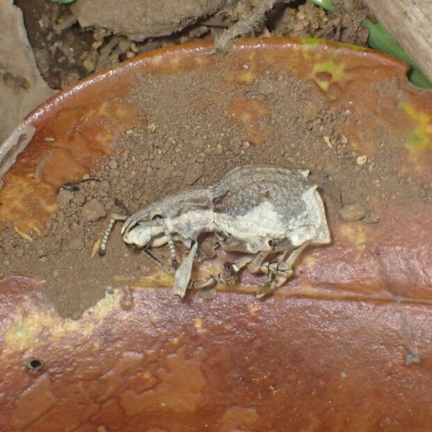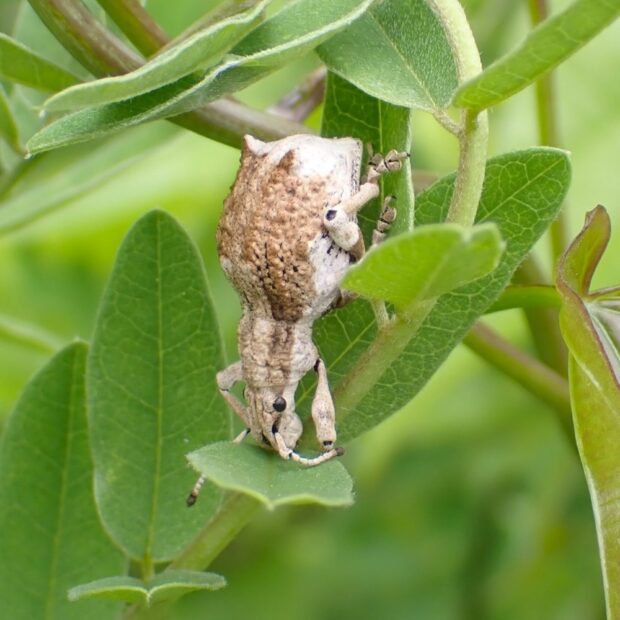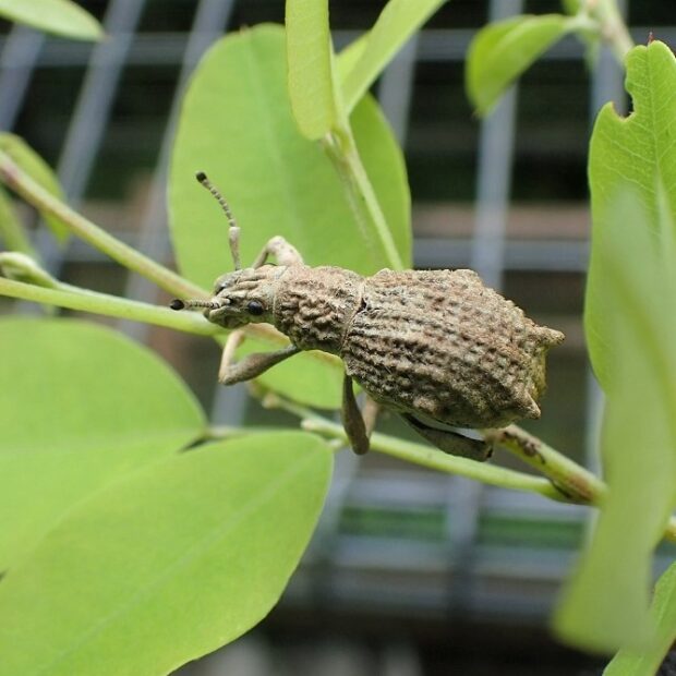 クチブトゾウムシの仲間。 体はごつごつした灰褐色で、 上翅後方にツンツンと突起があります。 ゆっくりと動き、 危険を感じると、 落下して死んだふりをします。 クズ、 ハギ、 フジなどマメ科の植物で見られます。