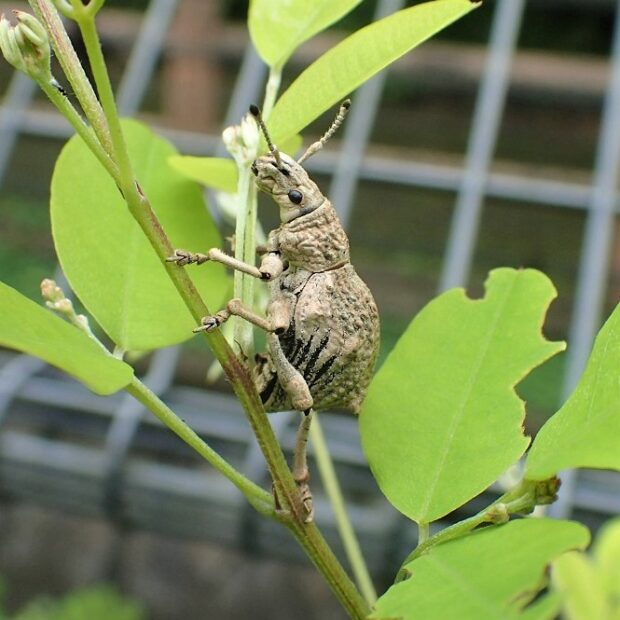 シロコブゾウムシは、 やや大きく、 灰褐色で上翅後方の2本の突起が目立ちます。 マメ科植物の葉を食べます。