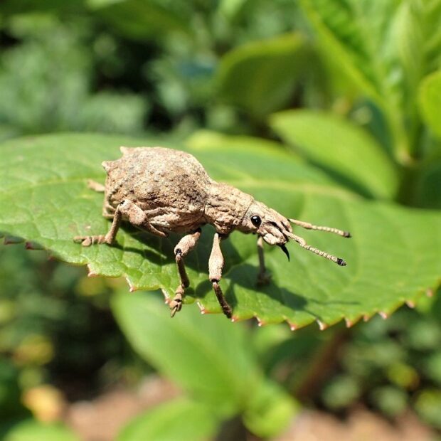 お尻がツンツン、 灰褐色の凸凹ゾウムシ