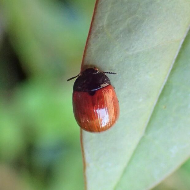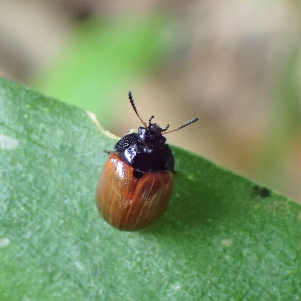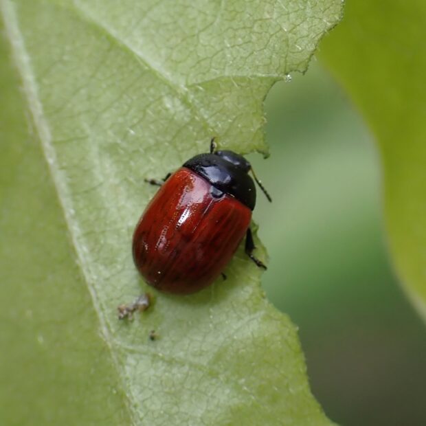 頭と胸は黒色で、 上翅は赤っぽいハムシ。 上翅が黒くなるのもおり、 変異が見られます。 成虫はフジの新芽が芽吹くとあらわれ、 葉を食べ始めます。