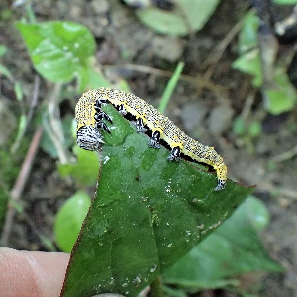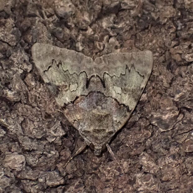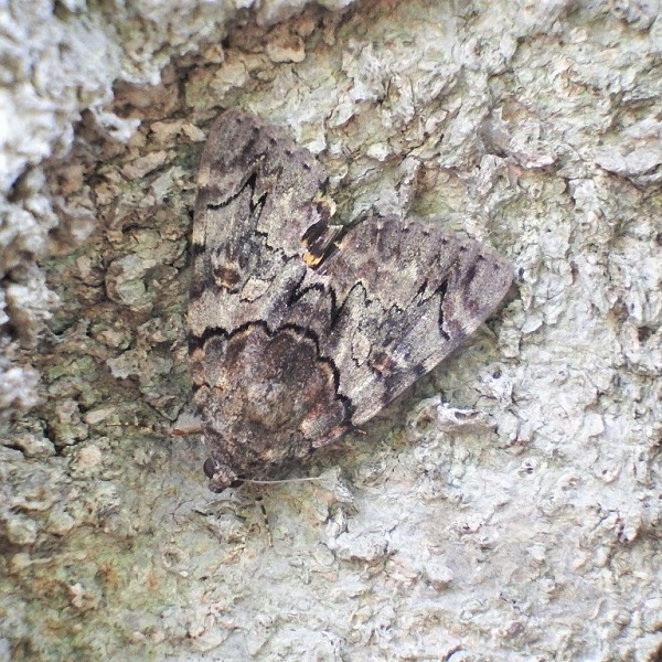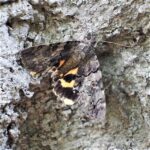 夏、 樹液によくやってくるシタバガの仲間。 前ばねは地味なまだら模様、 後ばねは派手な黄色と黒。 幹にとまっているときは木と一体となり目立ちませんが、 危険を感じるとパッと鮮やかな後ばねを見せます。 (MT)