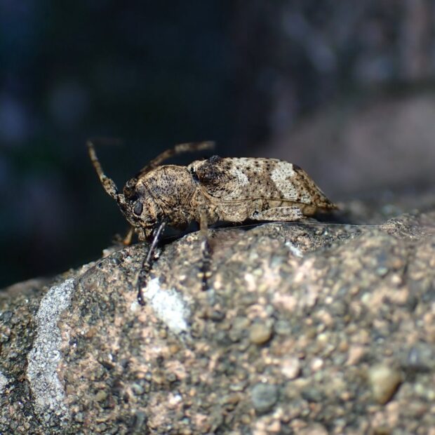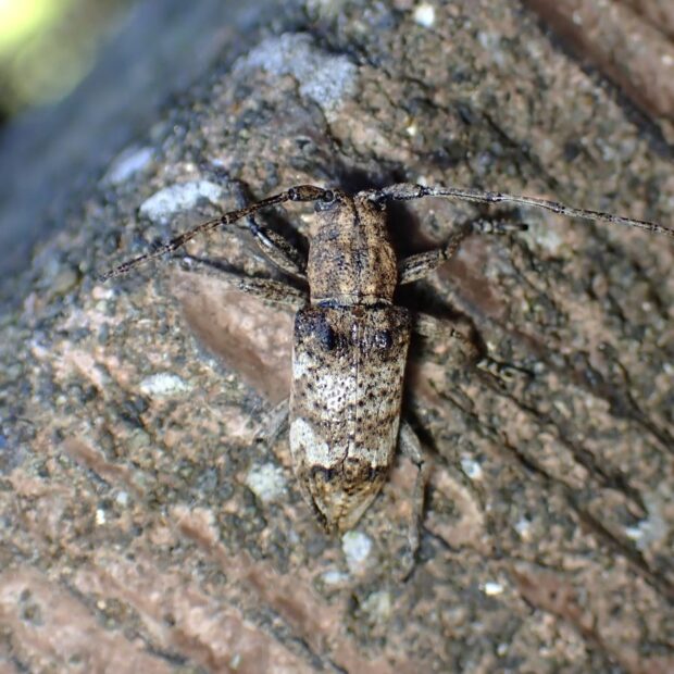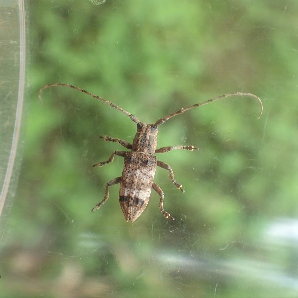 茶褐色で、 上翅(じょうし)の後ろの方に白と黒の帯があるサビカミキリの仲間。 平地~低山の雑木林などに生息し、 フジの枯れたツルで見られます。 とがっているはねの先端は、 少し開くのが特徴。 肩のあたりは黒い毛の束があり、 ふくらんでいます。
