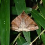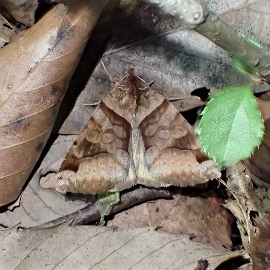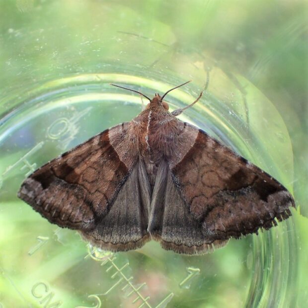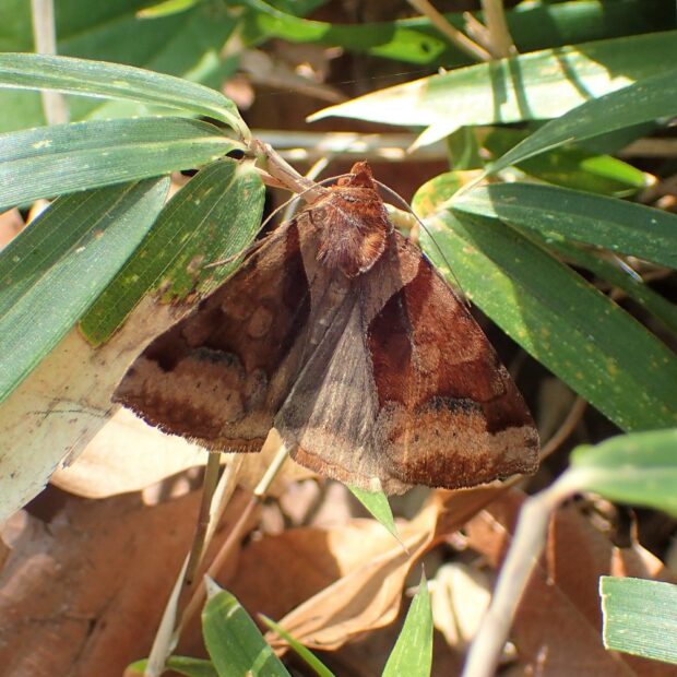 「V」字の線がはっきりしている茶色いガで、 普通に見られます。 はねにモヤモヤした模様があることから「雲紋(ウンモン)」と名づけられたようです。 ニセウンモンクチバとの見分けは難しいです。
