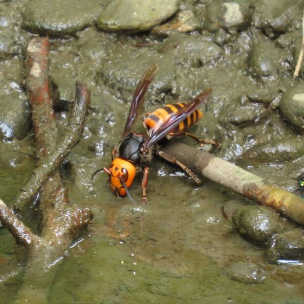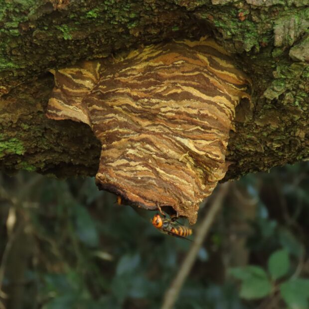 大型のスズメバチ。 越冬した女王バチは、 地中、 木の根元、 洞など閉鎖的な場所に、 5月頃から巣作りを始めます。 働きバチが羽化するのは6月頃で、 秋には大きな巣になります。 昆虫を捕らえて、 肉団子にして幼虫のエサにします。 ミツバチや他のスズメバチの巣を襲うこともあります。