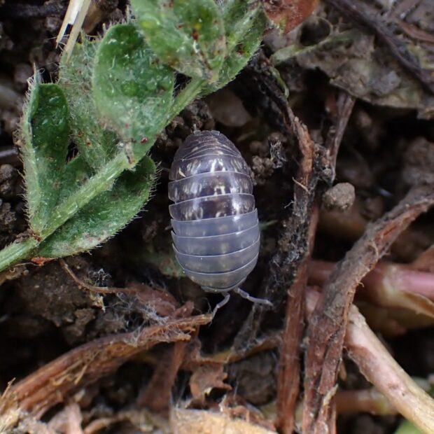 ヨーロッパ原産の外来種。 身を守るために丸くなります。 昆虫ではなく、 エビやカニと同じ甲殻類で、 あしは7対14本(生まれたては6対)あり、 暗くてじめじめしたところが好きです。 落ち葉などを食べて分解し、 土に返す役割があります。