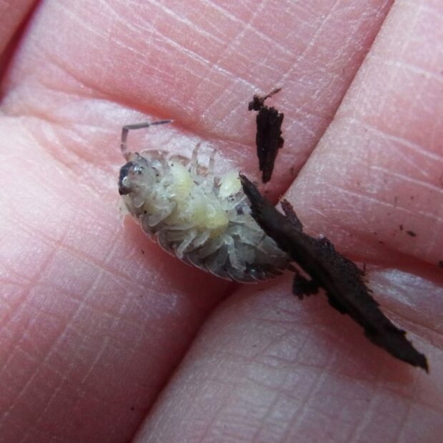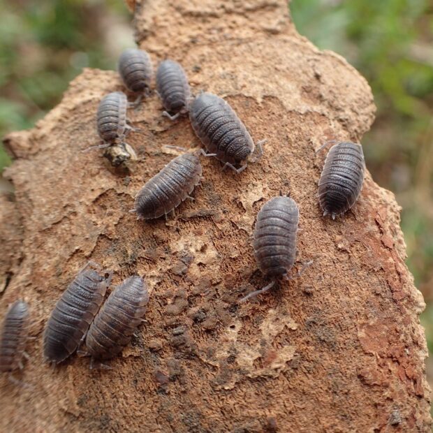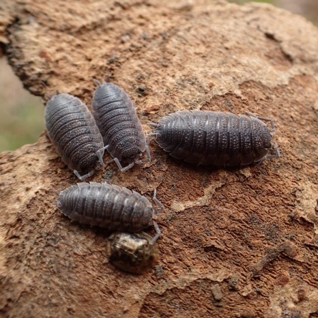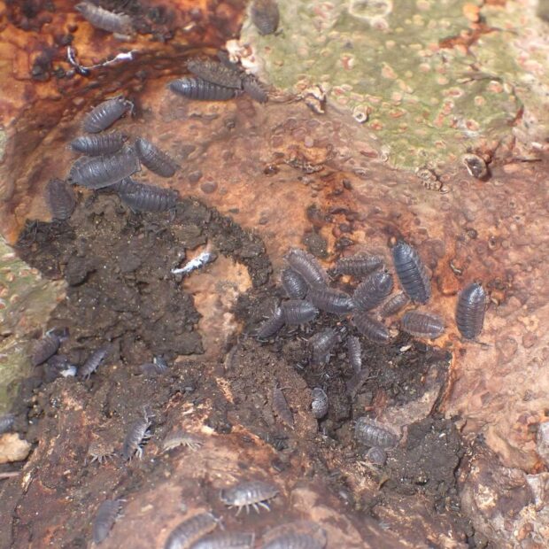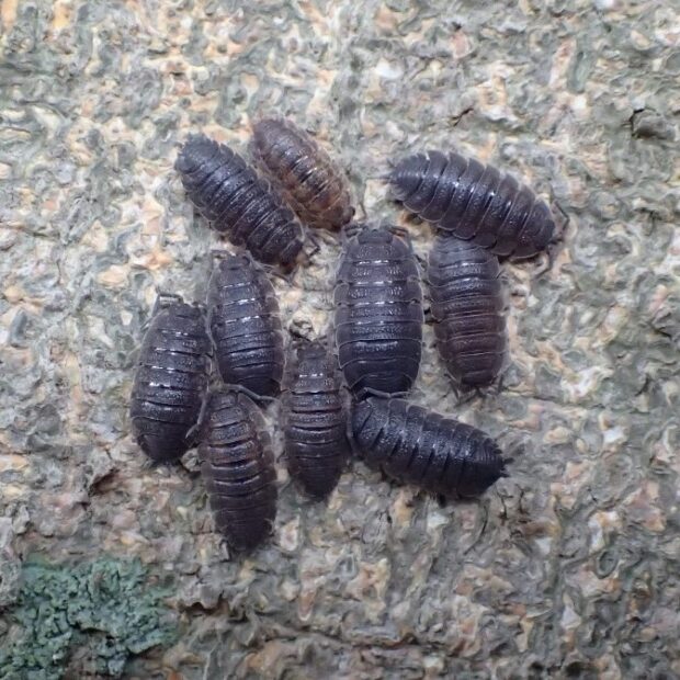 ヨーロッパ原産の外来種。 昆虫ではなく、 エビやカニと同じ甲殻類になり、 あしは7対14本(生まれたては6対)あります。 家の周りの石の下や地面、 樹木で普通に見られます。 落ち葉や生き物の死骸などを食べて、 土に返しています。