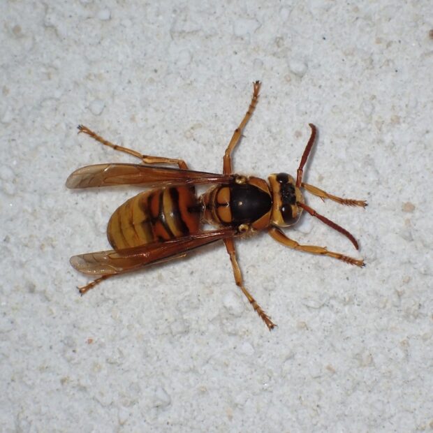 飛んでいるときは黄色一色に見えるスズメバチ。 木の枝、 屋根裏、 軒先、 橋の下などに巨大な巣を作ります。 巣は、 はじめは閉鎖的な空間に作られることが多いですが、 巣が大きくなってくると、 広い空間に引っ越しをして新しい巣を作ります。