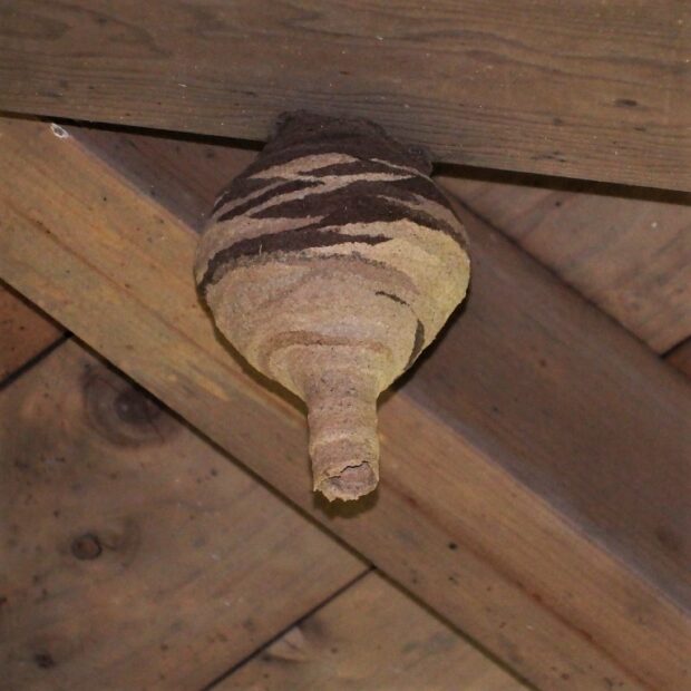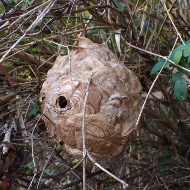 街中で見られるスズメバチ。 オオスズメバチと似ていますが、 体も頭も小さめです。 巣は小さく、 庭木の茂みや屋根のひさしなどに作ります。 巣は、 作り始めはとっくりを逆さまにしたような特徴のある形をしていますが、 働きバチが出てくる頃になると、 下の部分が取り払われて丸い巣になります。