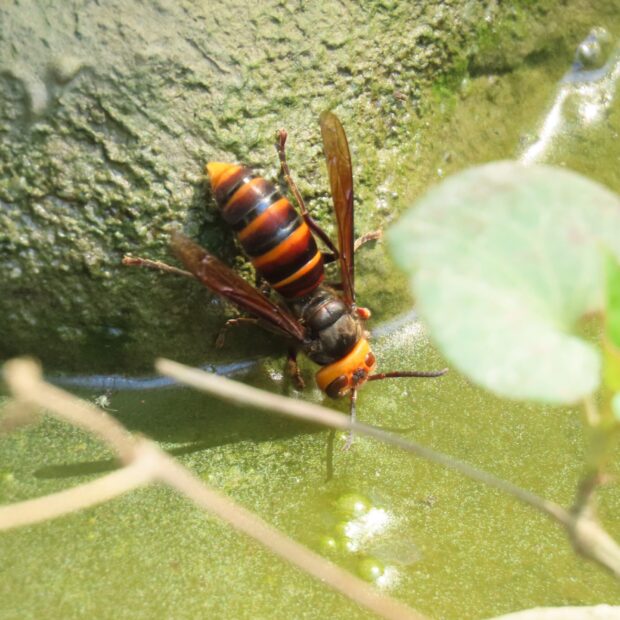 街中で見られるスズメバチ。 オオスズメバチと似ていますが、 体も頭も小さめです。 庭木の茂みや屋根のひさしなどに小さな巣を作ります。 巣は、 作り始めはとっくりを逆さまにしたような特徴のある形をしていますが、 働きバチが出てくる頃になると、 下の部分が取り払われて丸い巣になります。
