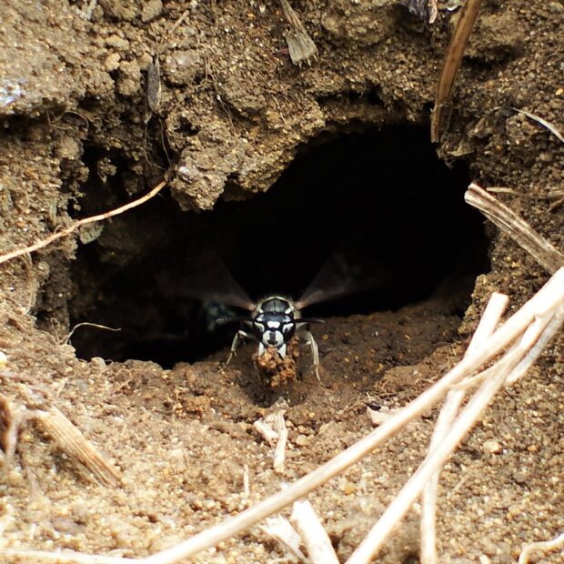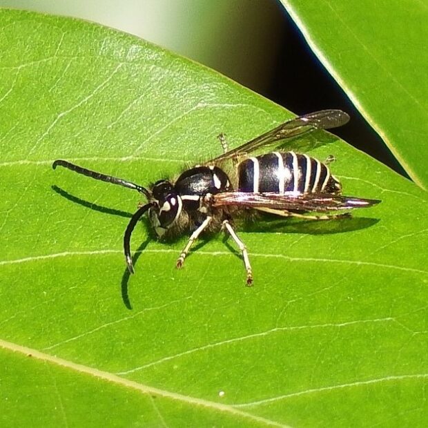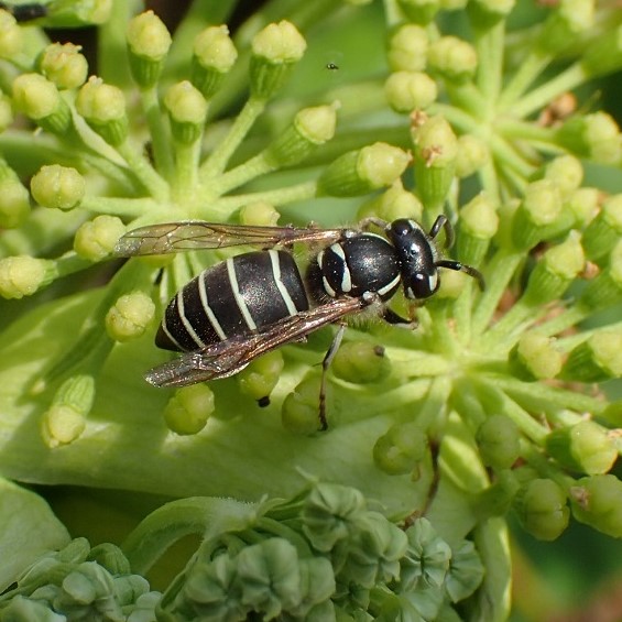 黒色に白いしまがあるスズメバチ。 ミツバチほどの大きさで、 比較的おとなしく攻撃的ではありません。 地中や木のうろに巣を作ります。 越冬した女王バチの活動は4月から12月頃までで、 活動の期間が長いです。 昆虫などの他、 いろいろな生き物の死骸に集まり肉団子を作ります。