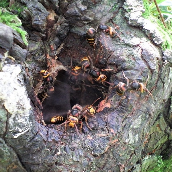 お腹の帯が波型になっているスズメバチ。 木のうろ、 地中などに巣を作りますが、 狭くなると、 広い場所に引っ越をして巣を作り直す性質があります。 いろいろな昆虫を捕らえ幼虫のエサにしますが、 特にセミを好むようです。