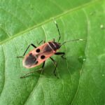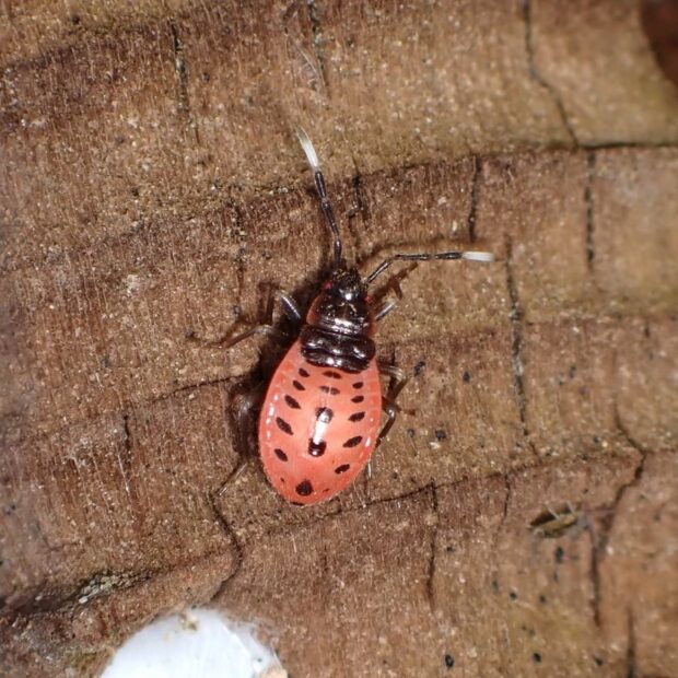 オオホシカメムシと似ていますが、 ヒメホシカメムシの方が小さく、 黒い紋の模様がちがいます。