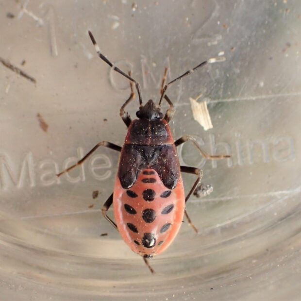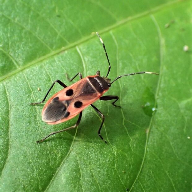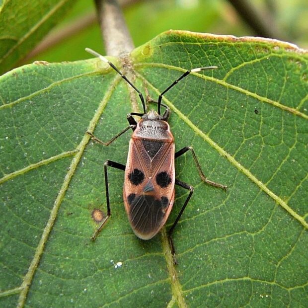 赤褐色のはねに黒色の紋があるカメムシ。 アカメガシワの花や実によくやって来ます。 シイ、 クワ、 コウゾなどの花や実にも集まることがあります。