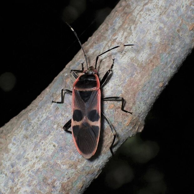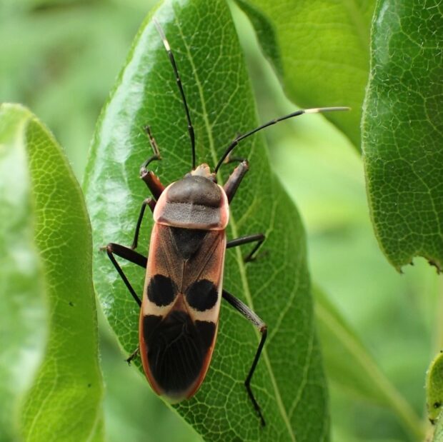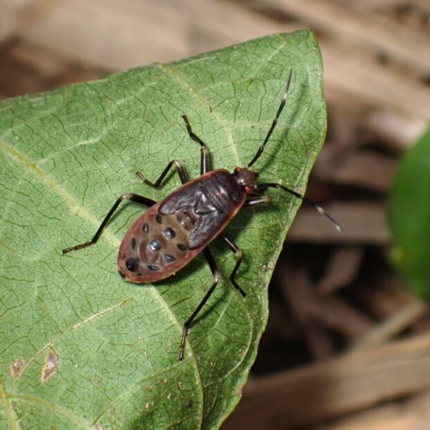 赤褐色の大きな細長いカメムシで、 黒色の丸い紋が目立ちます。 アカメガシワの花や実によくやって来ます。 ミカンやモモを食べることもあります。