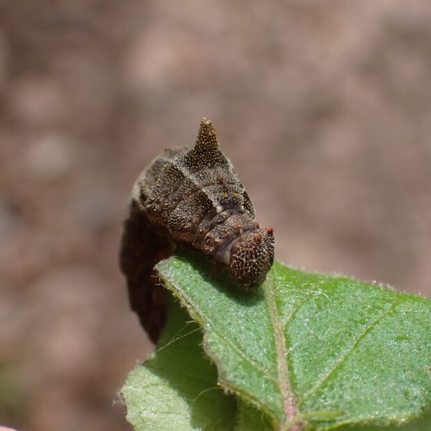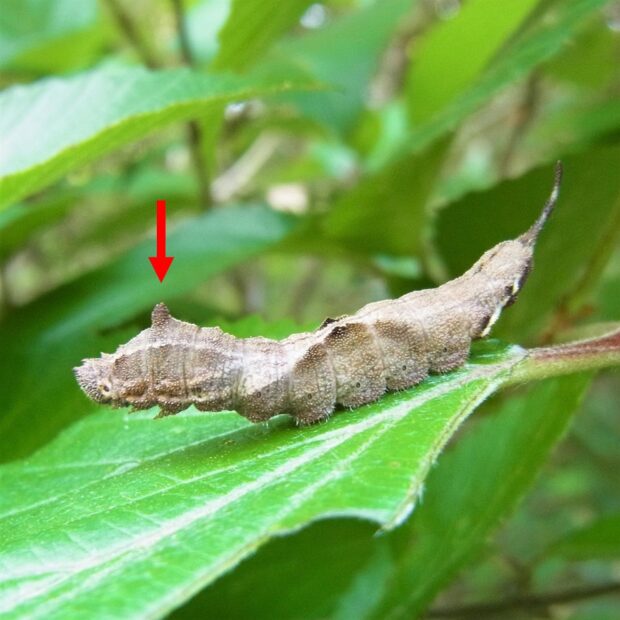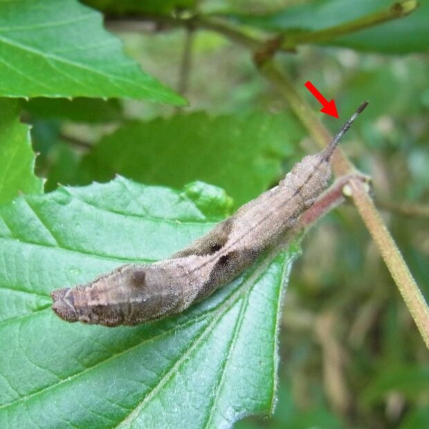 • 幼虫。 お尻の方にしっぽのような尾状突起(びじょうとっき)がある。 葉の表面で見つかる。