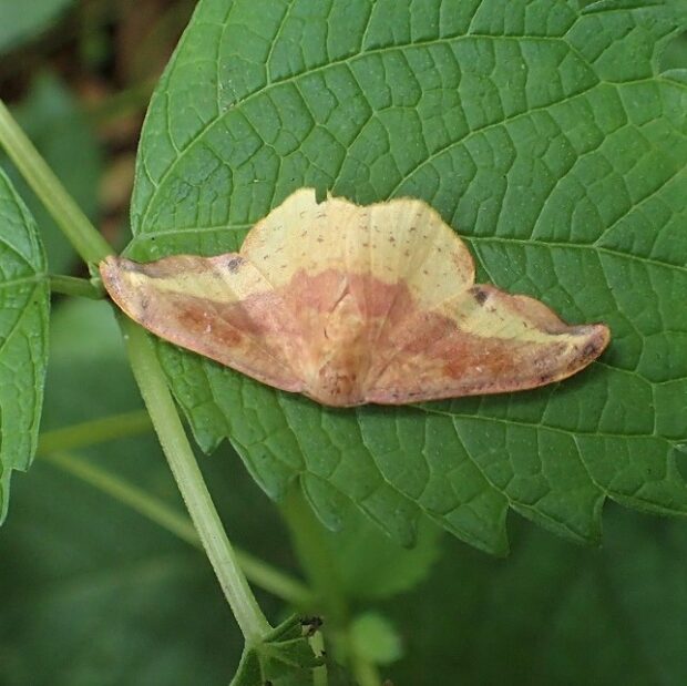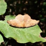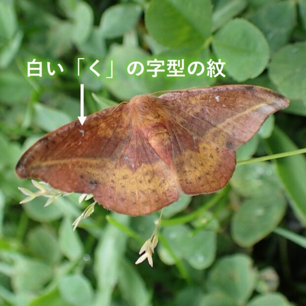 カギバガの仲間。 前ばねの形は、 先端が曲がったカギ状。 色や模様はそれぞれ違いますが、 前ばねに小さくて白い「く」の字型の紋があります。 幼虫は、 胸に突起があり、 しっぽのような尾状突起(びじょうとっき)がついています。