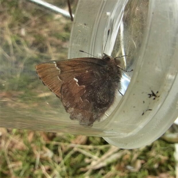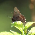 早春にのみあらわれる茶色っぽいシジミチョウ。 せわしなく飛び、 よく枝先や葉にとまります。 はねの表に青い部分がありますが、 はねを閉じてとまるので、 見ることはできません。 雑木林や山に生息し、 街中では見られません。 (MT)
