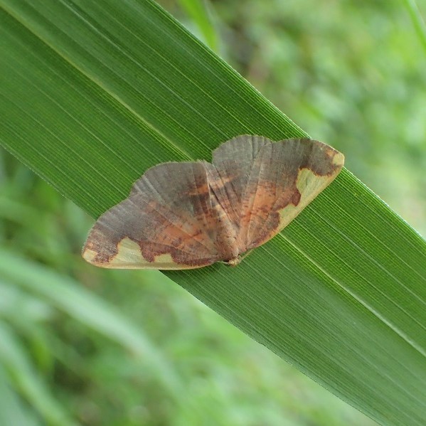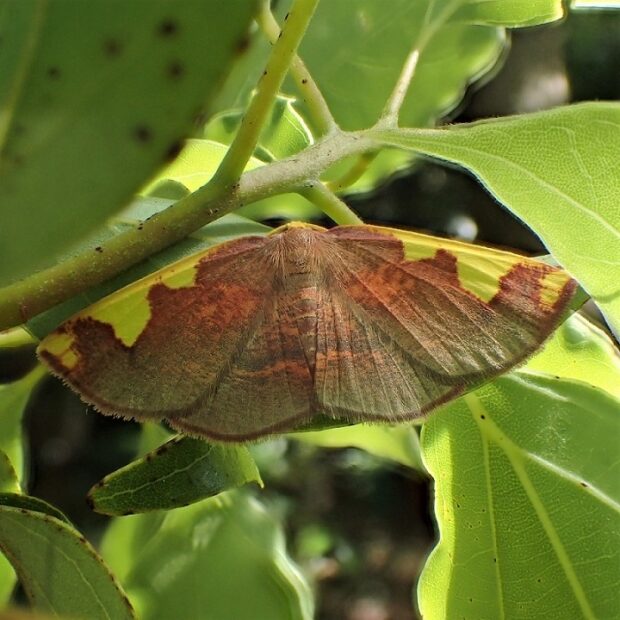 モチノキの仲間で見られるエダシャクの仲間。 茶色で、 前ばねのふちの黄色い波模様が特徴的。 市街地でも見られます。 オオマエキトビエダシャクという似た種類がおり、 はねの先端の黄色の紋の形で見分けます。 (MT)