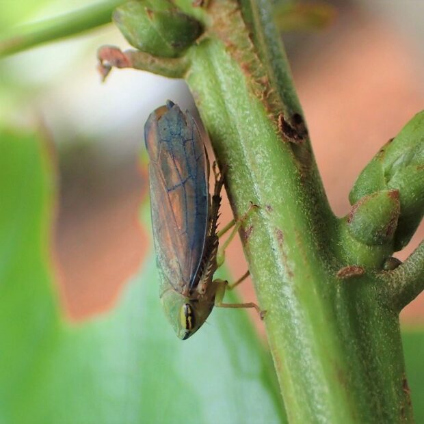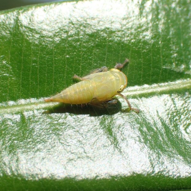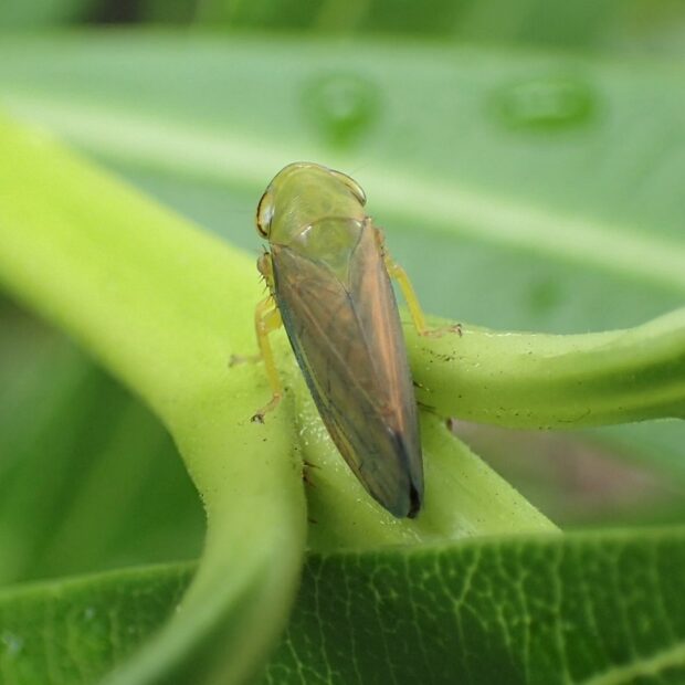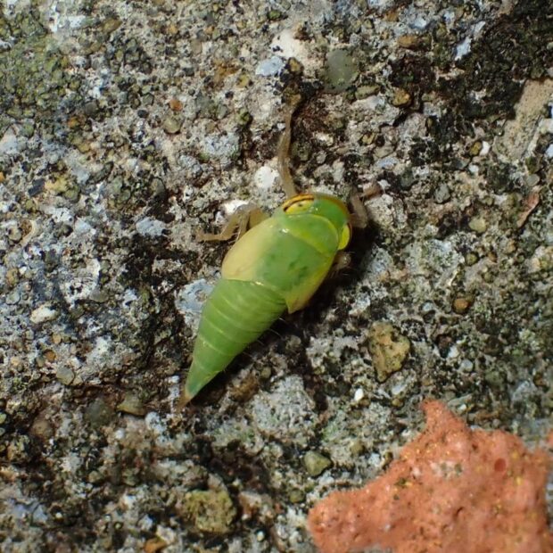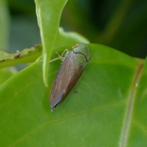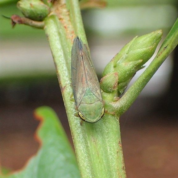 平べったい大きな頭のヨコバイ。 体の色は黄緑色、 はねは明るい茶色、 複眼には黒い横線がはいっています。 ちょっと悪そうで、 ユニークな顔をしています。 南方系のヨコバイで、 関東地方では少ないです。 (MT)