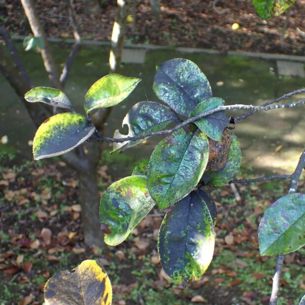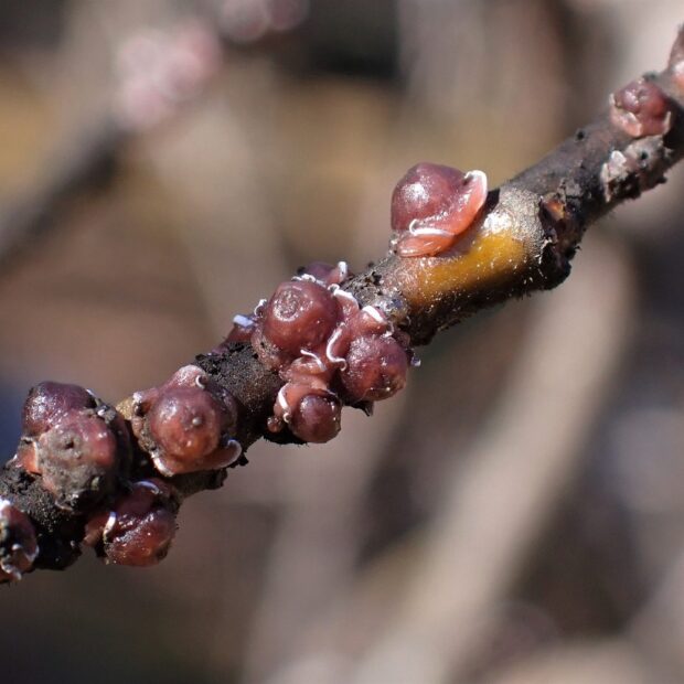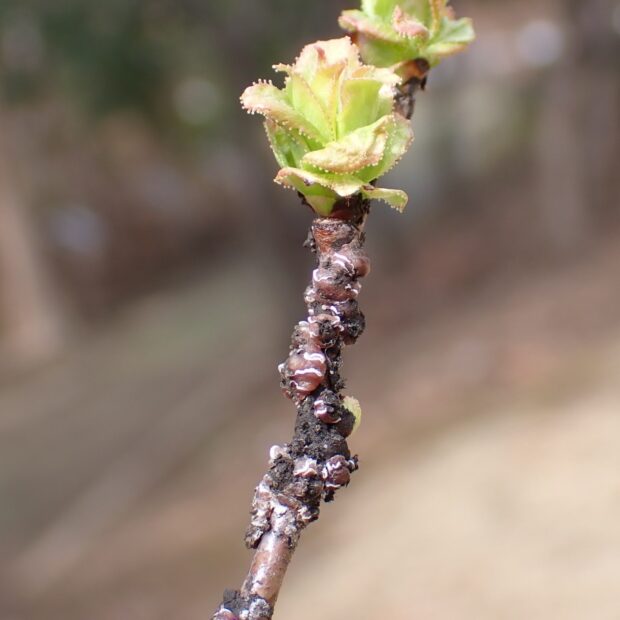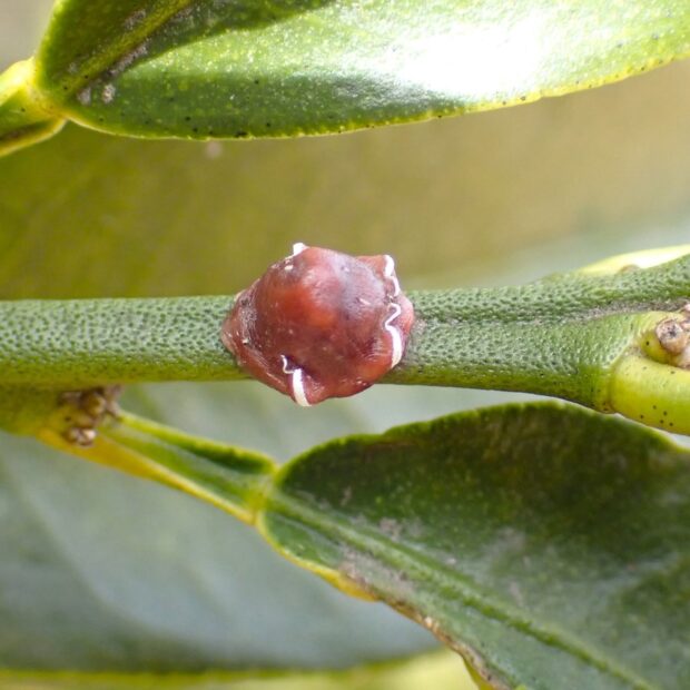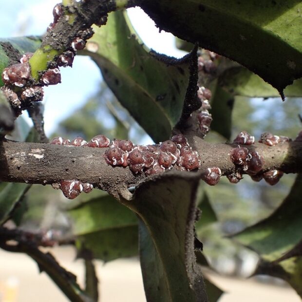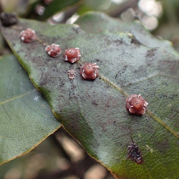 白い模様が入っているあずき色のカイガラムシ。 昆虫の体は、 あずき色のヘルメットのようなもので覆われており、 見ることはできません。 さまざまな木で見られ、 集団で木の汁を吸っています。 ルビーロウムシに寄生するルビーアカヤドリコバチというハチがいます。