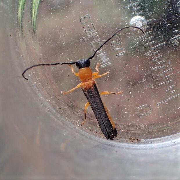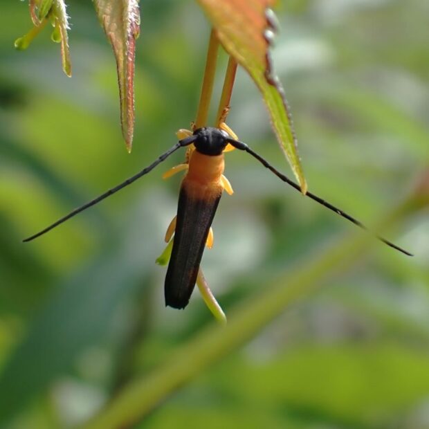 頭が黒、 胸が鮮やかなオレンジ色のカミキリムシ。 市街地の公園のサクラなどで、 普通に見られます。 成虫は、 葉の裏から葉脈をすじ状にかじって食べます。 メスは生木の細い枝に産卵します。 幼虫は材を食べて成長し、 成熟すると枝先を斜めに切断し、 切断面に木屑を詰めて越冬します。