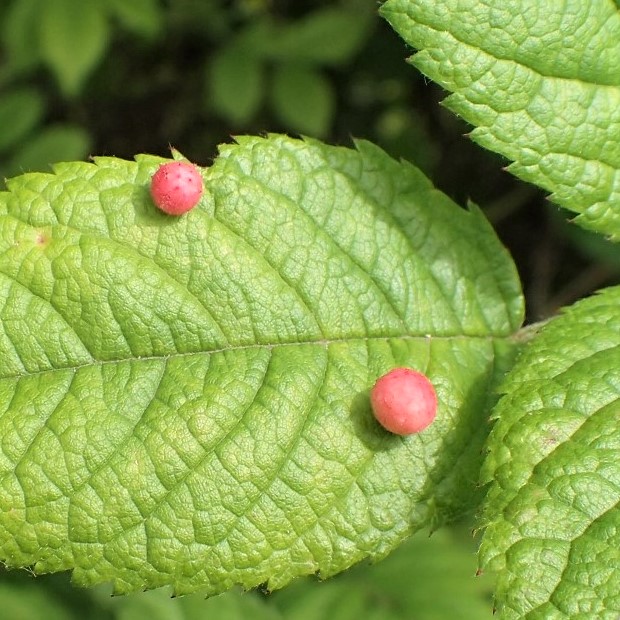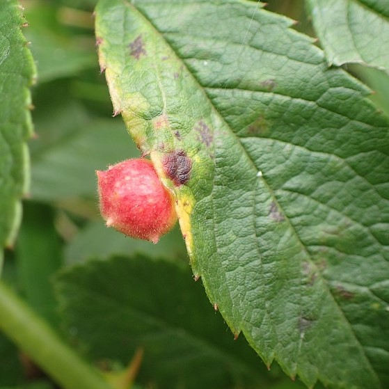 バラハタマバチという小さなハチが、 バラの葉や若い実に作った虫こぶ。 黄白色や赤色の丸い虫こぶで突起があります。 虫こぶは6~7月に葉から落ち、 虫こぶ内で幼虫で越冬し、 春に成虫が出てきます。
