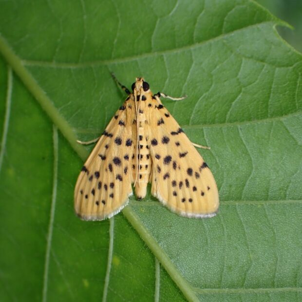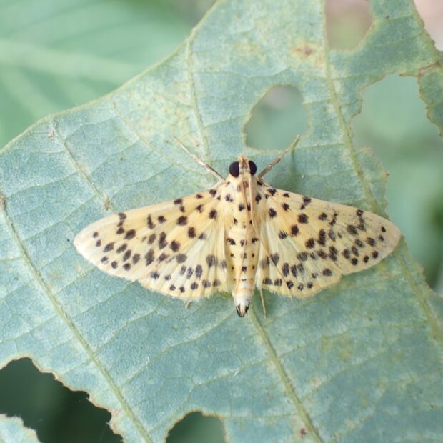 ツトガの仲間。 黄色っぽいはねに黒点が散らばった小さなガ。 幼虫は果実(クリ、 モモ、 ウメ、 カキ、 ブドウ、 ナシ、 ミカンなど)を食べることが知られています。
