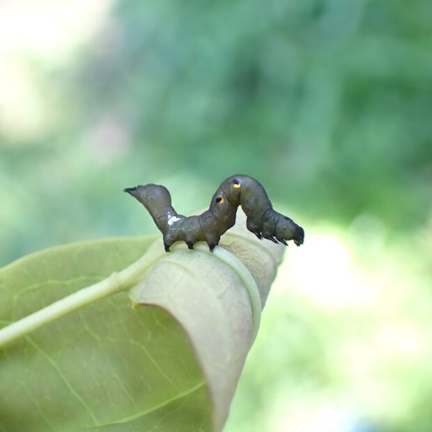 • 頭は右。 腹脚は4対あるが、 頭に近い脚は小さく3対のように見える。 腹脚で枝をしっかりつかむ。