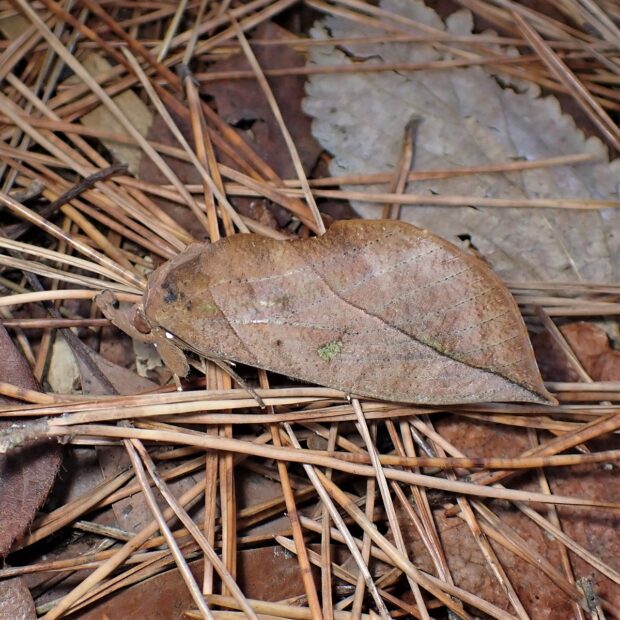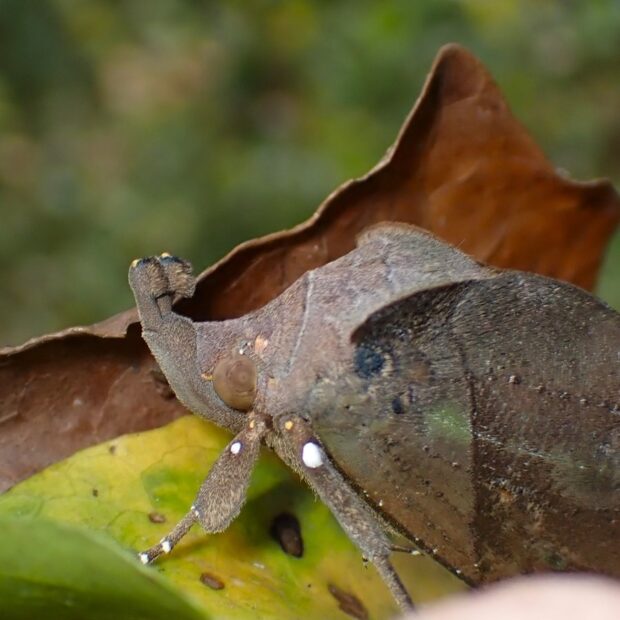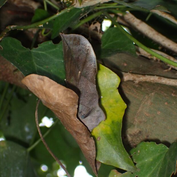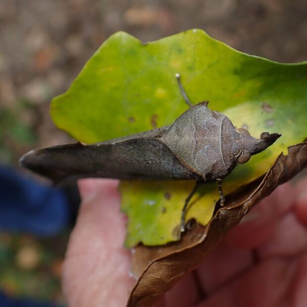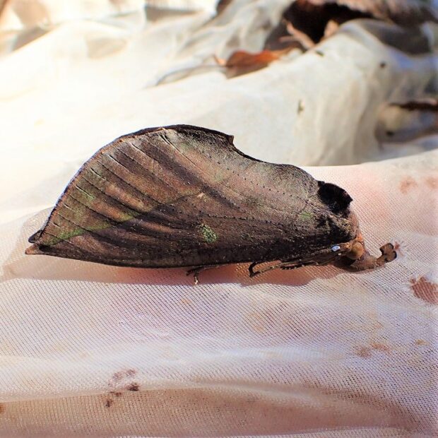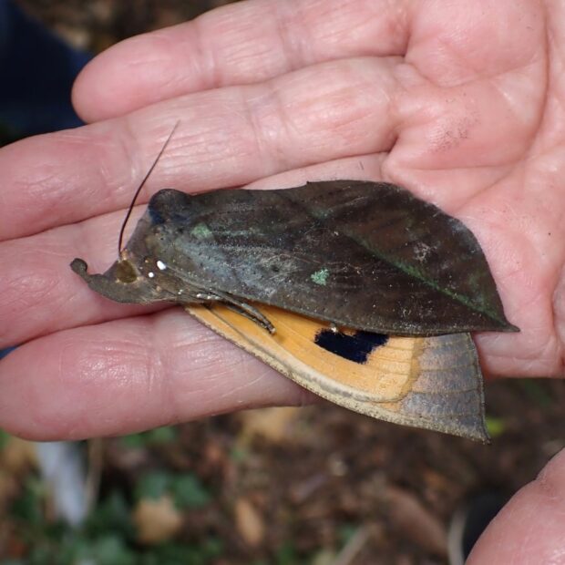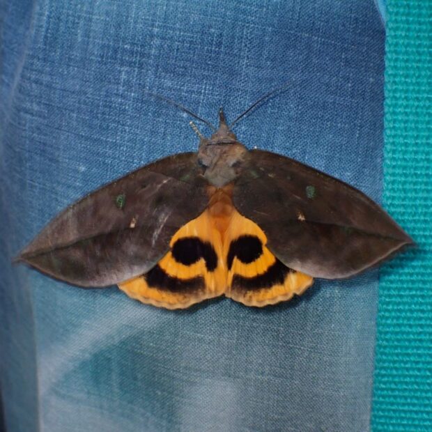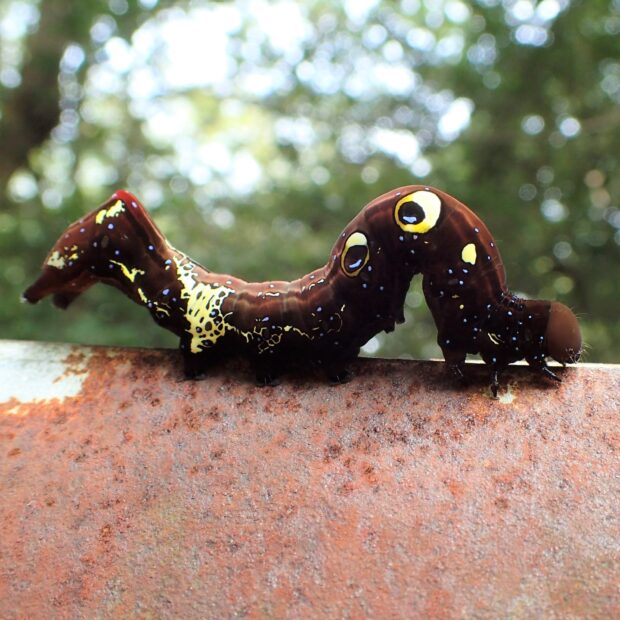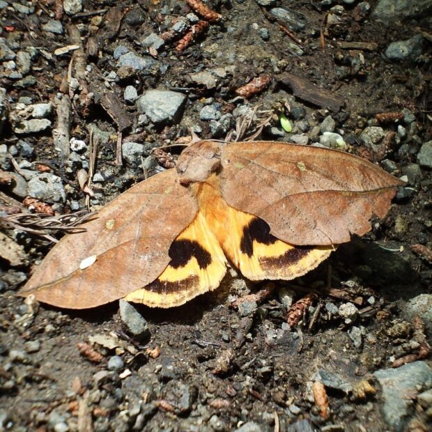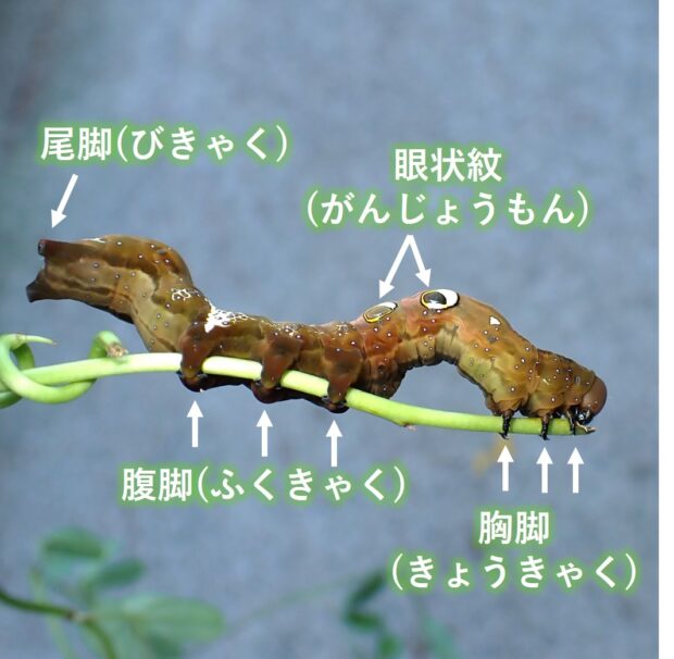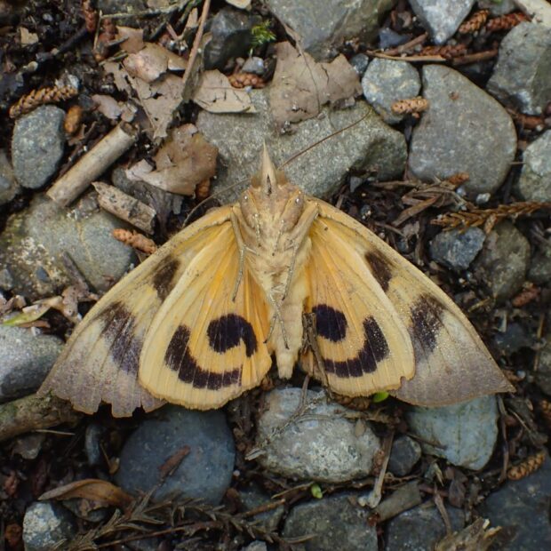 市街地でも見られるヤガの仲間。 驚くと、 後ばねの黄色と黒のうずまき模様をパッと見せます。 夜間に飛び、 ブドウ、 モモ、 アケビなどの果実の汁を吸います。 幼虫は目玉模様があるユニークな姿!独特のポーズでアケビなどの枝にとまっています。