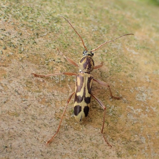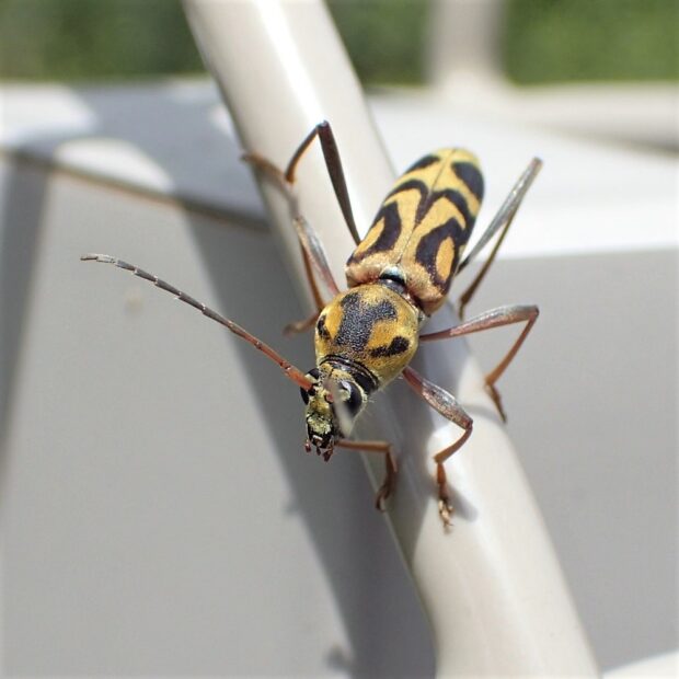 家の周りの枯れたタケやタケの垣根などで見られるトラカミキリ。 市街地でも見られ、 トウモロコシ畑にもやって来ることがあります。 カミキリムシにしては触角が短く、 黄色と黒の模様をしており、 ハチのよう?幼虫はタケの柵やタケ製品を食べます。