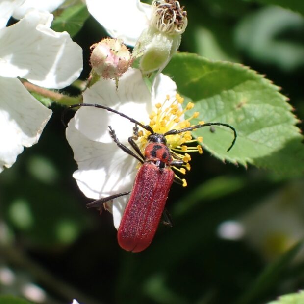 前胸に黒い紋がある、 赤いカミキリムシ。 クリ、 ネギ、 ハゼノキなどいろいろな花を訪れ、 竹林などで普通に見られます。 成虫をつかむと、 刺激臭がします。 メスは弱ったタケや伐採されたタケに産卵し、 幼虫はタケを食べて育ちます。