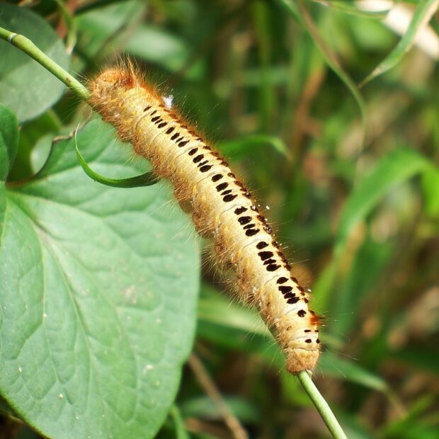 幼虫(毛虫)と繭には毒針毛がありますので、 触らないでください。 刺された場合は、 粘着テープで毛を取り除き、 流水で洗い流してください。