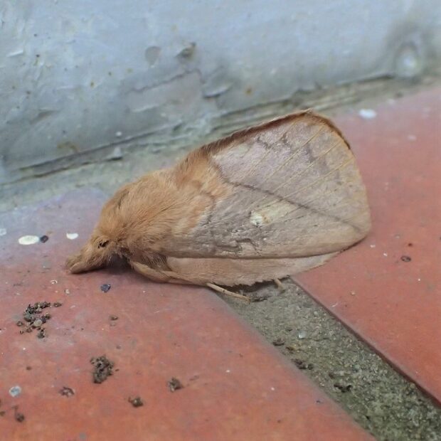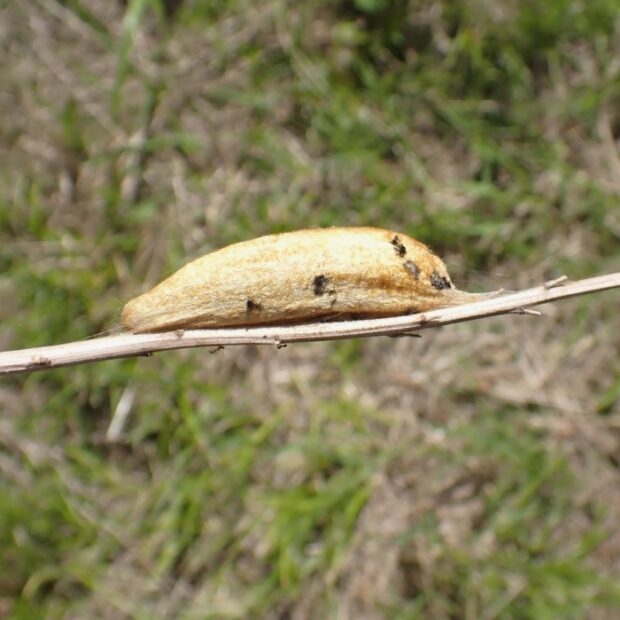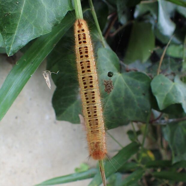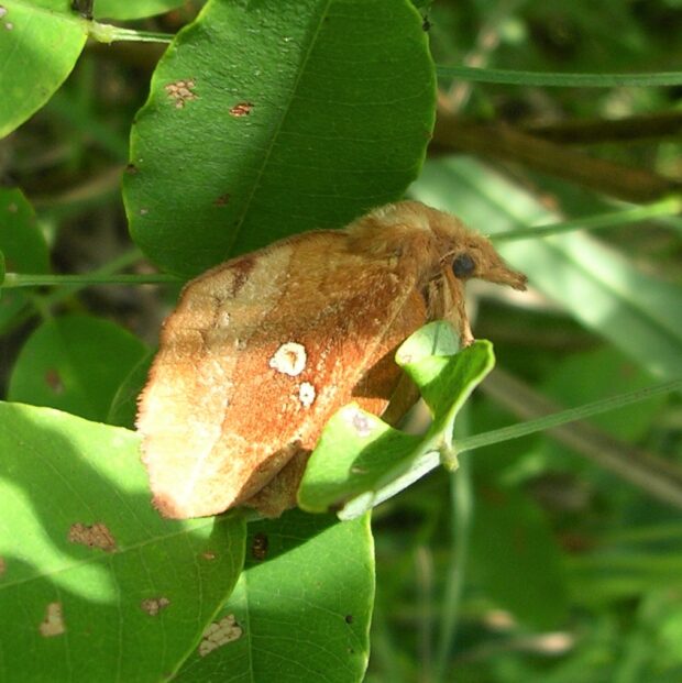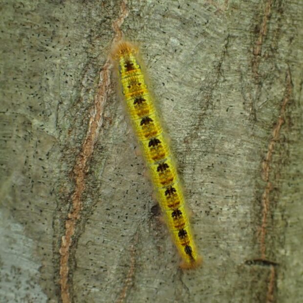 茶色っぽいはねに白い2つの紋を持つカレハガの仲間。 幼虫はササやタケの葉を食べて育ちますので、 これらの植物が生えている所で見られます。 黄色い幼虫は大きく存在感があり目立ちます。