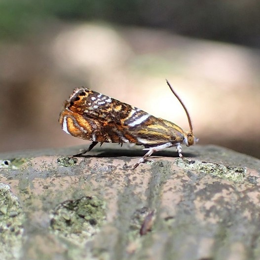 色や模様が美しい小さなガ。 後ずさりをしたり回ったり、 おもしろい動きをします。 光の角度でメタリックな輝きがあらわれます。 (MT)